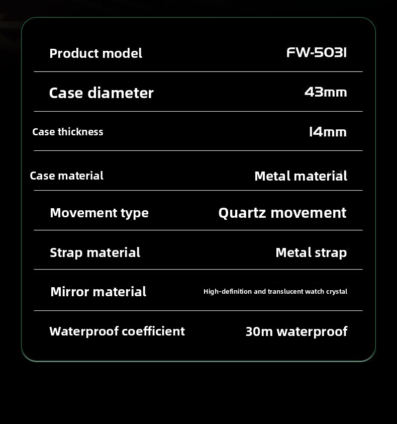 • Water Resistance: 30 meters